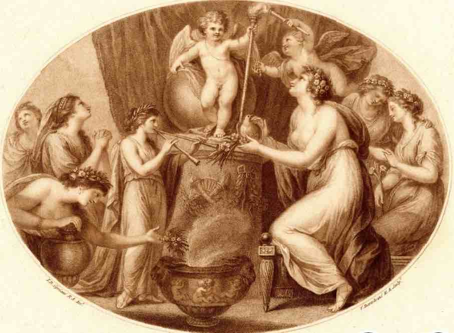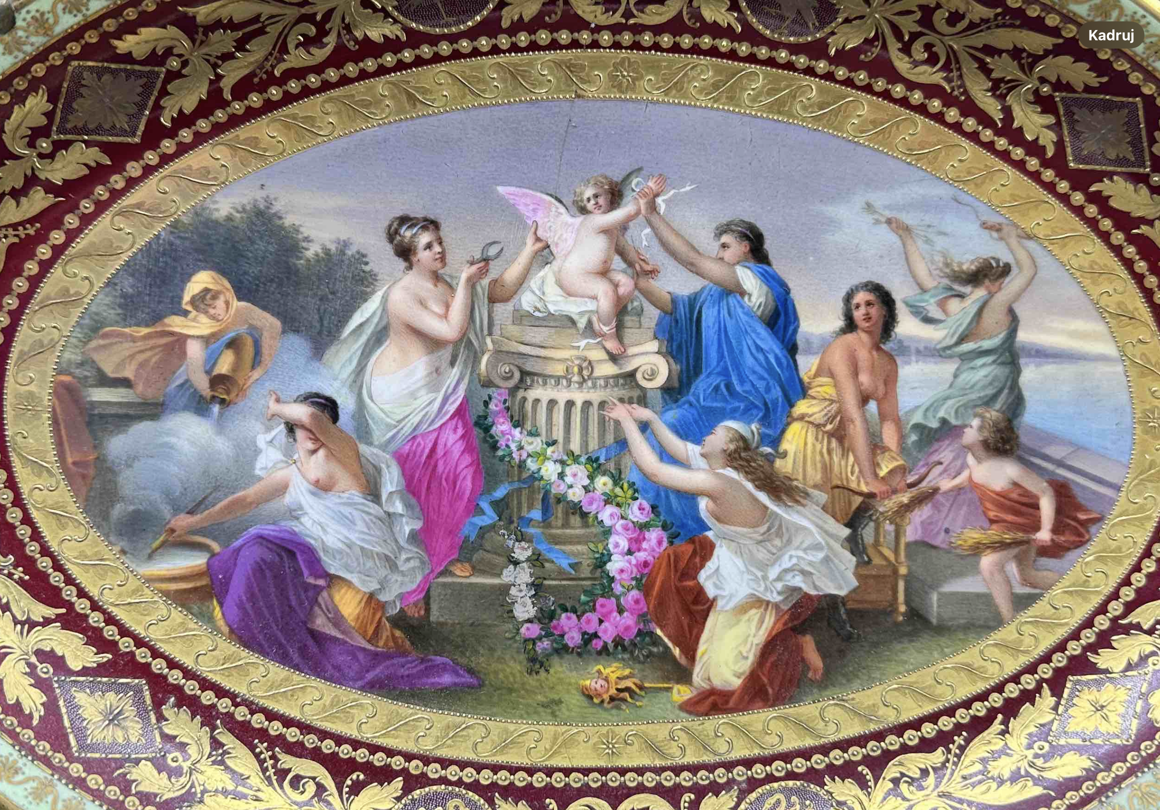 Dekoracja wielobarwna naszkliwna, cechująca się profesjonalnym, wysoce artystycznym przekazem obrazu mitologicznego, będącego interpretacją znanej ryciny „A Sacrifice to Cupid” Francesco Bartolozzi (1783) po Giovannim Battista Ciprianim, (Ofiara dla Kupidyna). W dekoracji tej kupidyn siedzi na ołtarzu/kolumnie, wokół niego jest grupa kobiet składających dary, girlandy kwiatów, instrumenty, kadzielnicę itd.