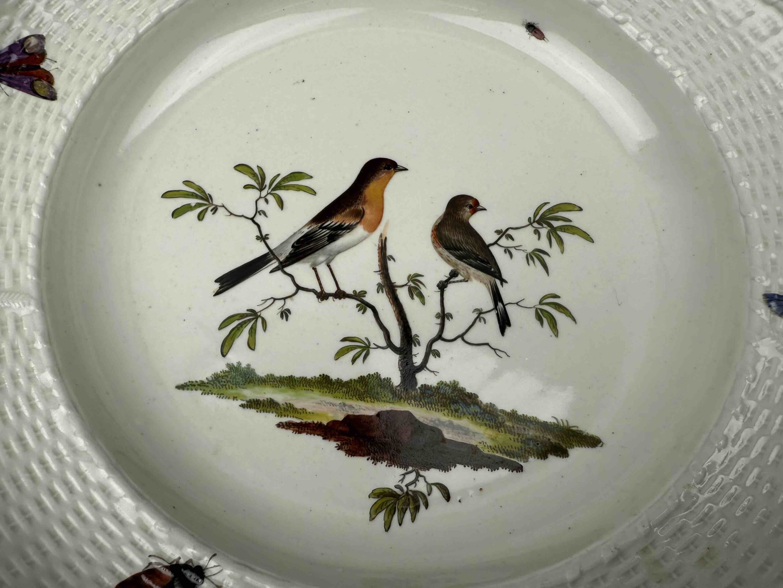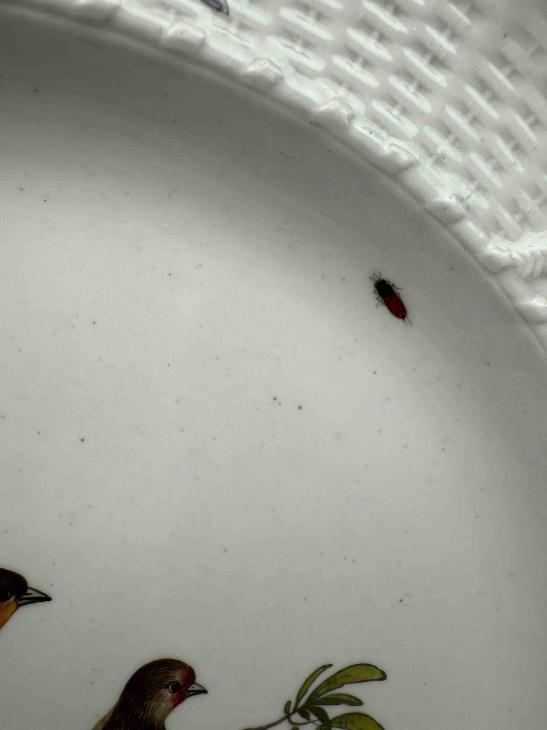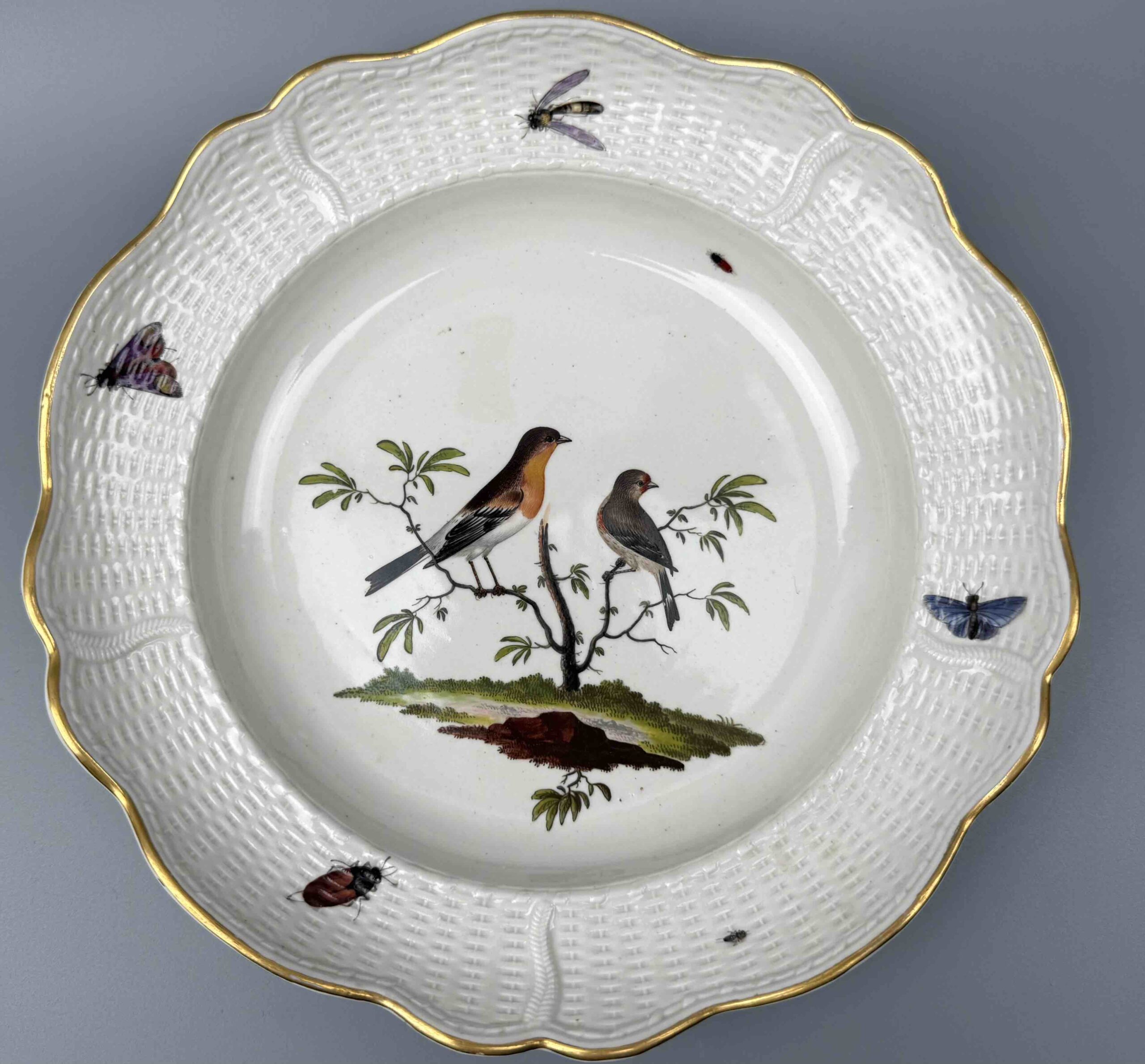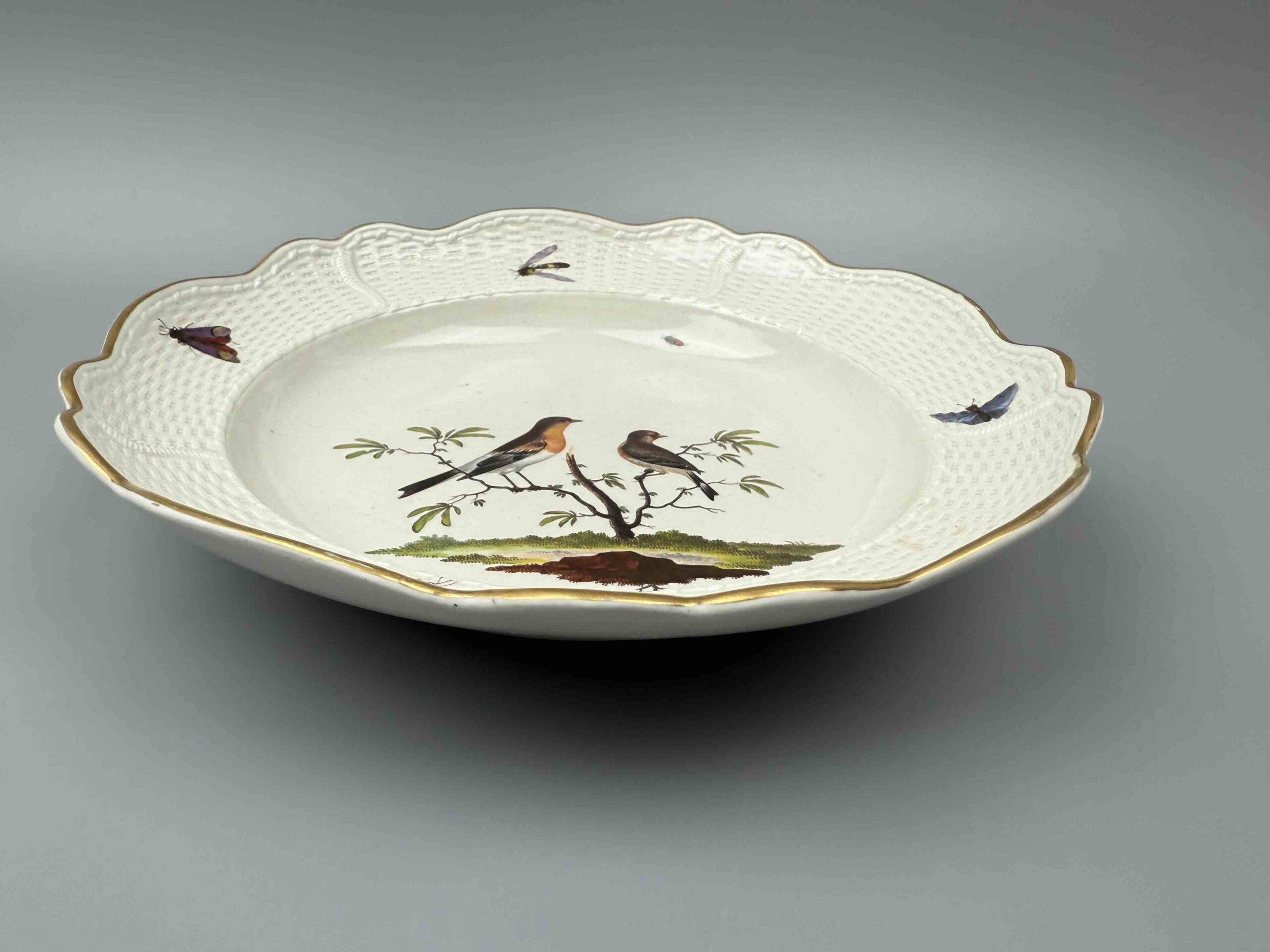 Talerz mocno wgłębiony o nieregularnym brzegu, zdobiony reliefem “neu ozier”. Wielobarwna dekoracja naszkliwna, motyw ptasi i owadzi przedstawiający parę ptaków na gałęzi oraz pojedynczych owadów latających umieszczonych na kołnierzu. Brzeg talerza złocony.