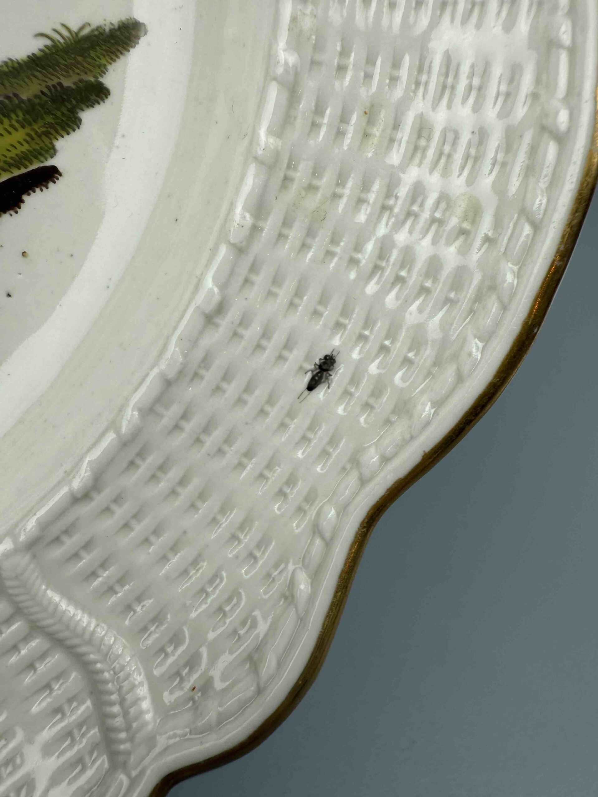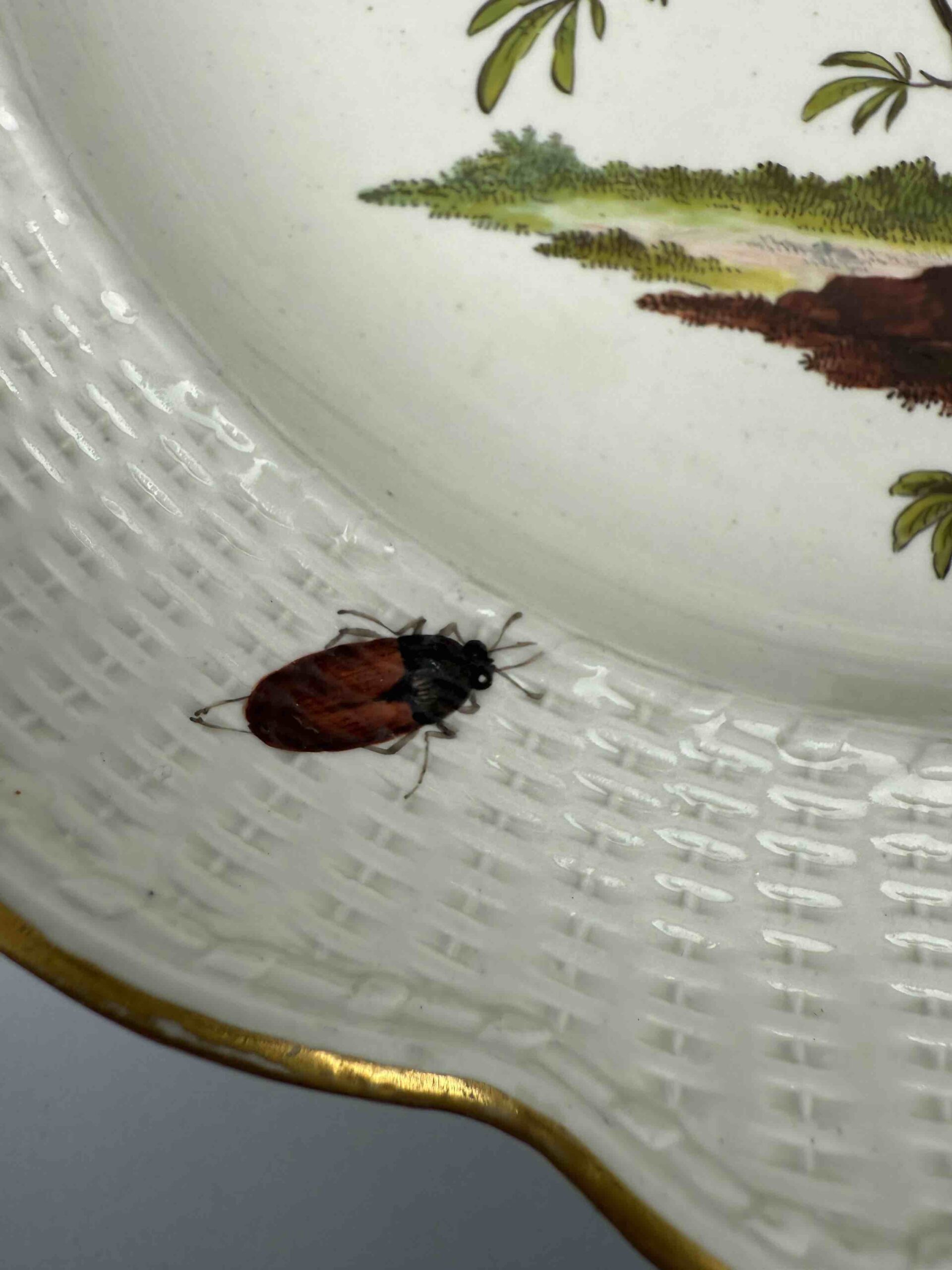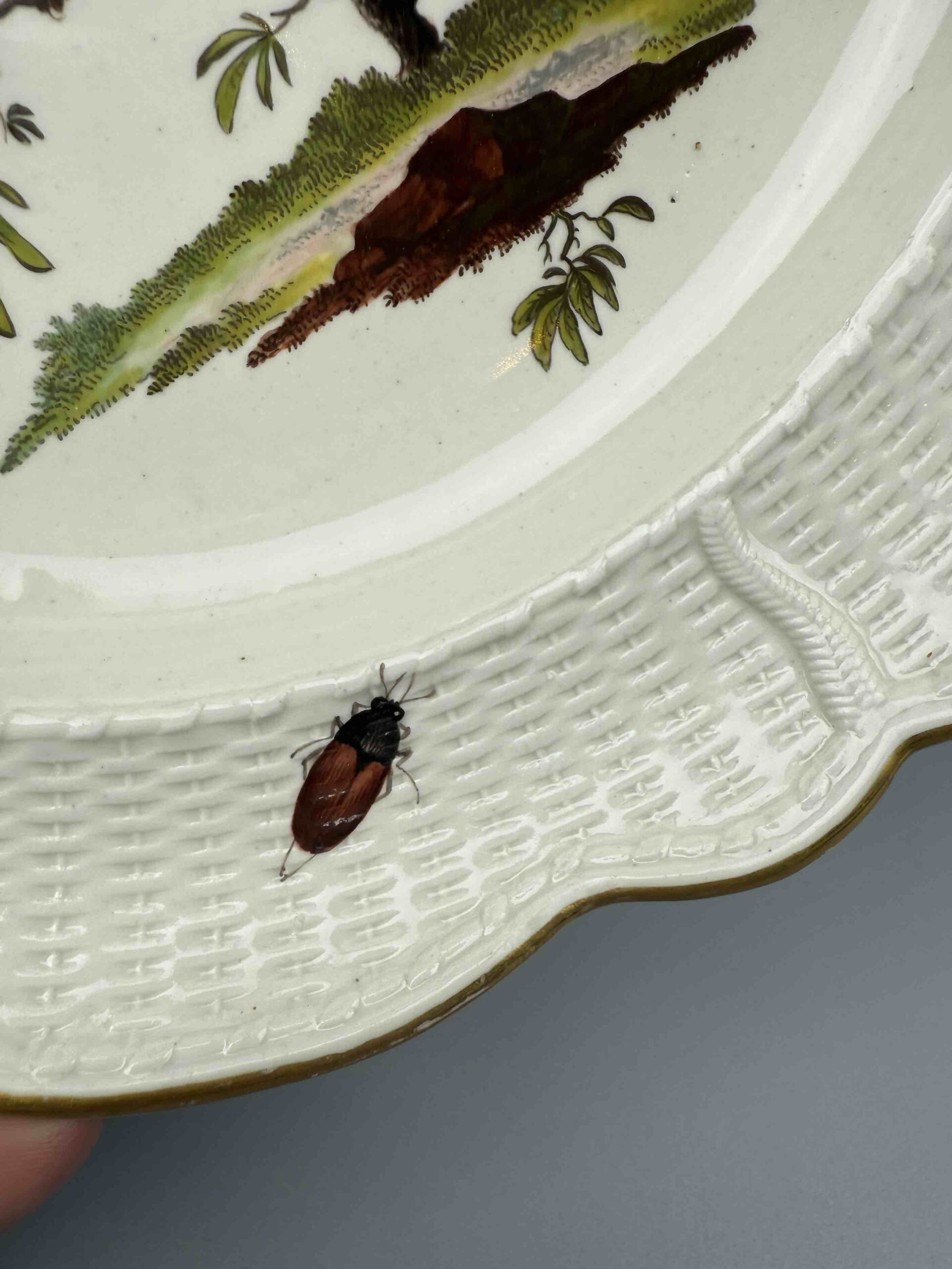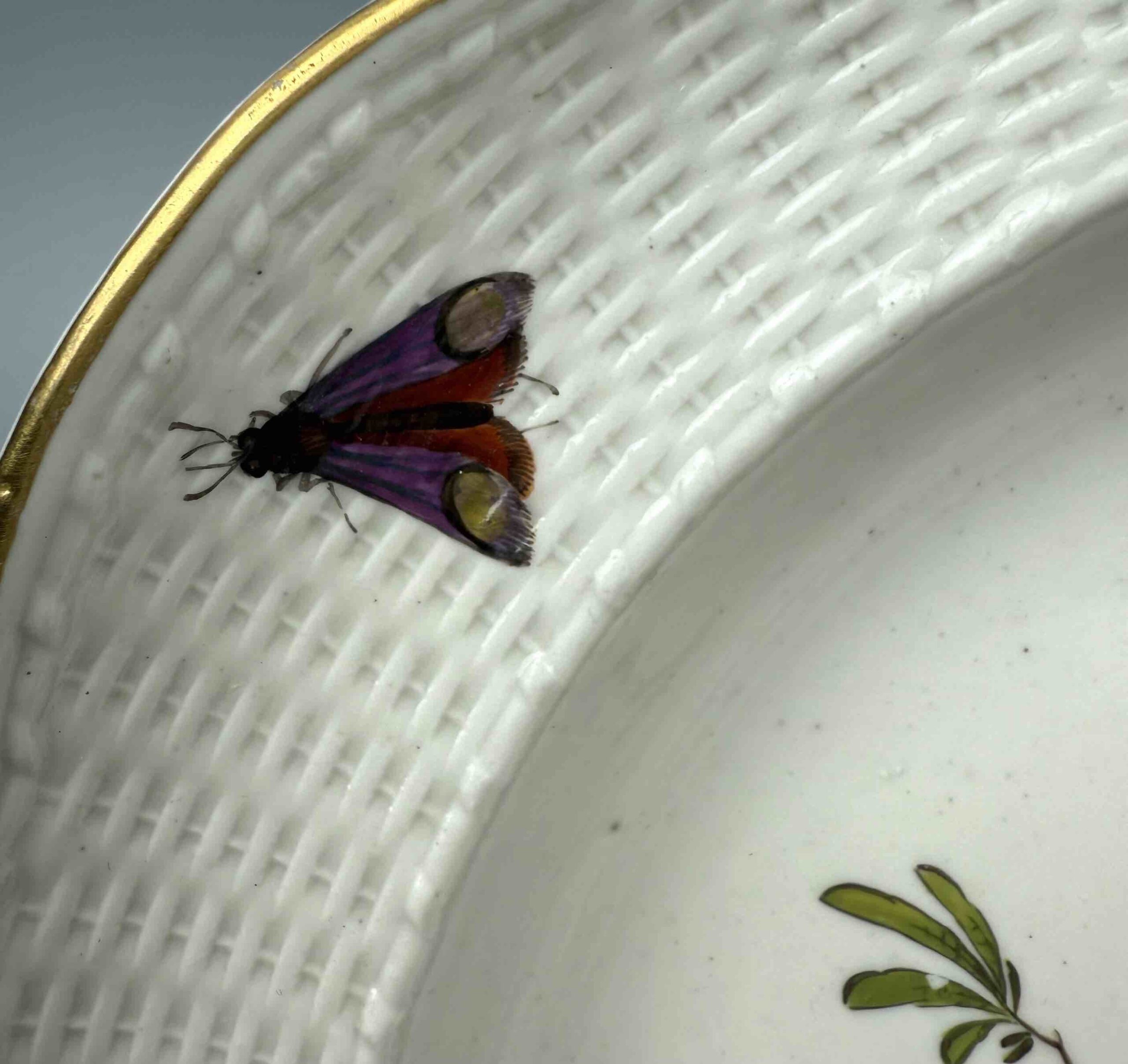 Talerz mocno wgłębiony o nieregularnym brzegu, zdobiony reliefem “neu ozier”. Wielobarwna dekoracja naszkliwna, motyw ptasi i owadzi przedstawiający parę ptaków na gałęzi oraz pojedynczych owadów latających umieszczonych na kołnierzu. Brzeg talerza złocony.