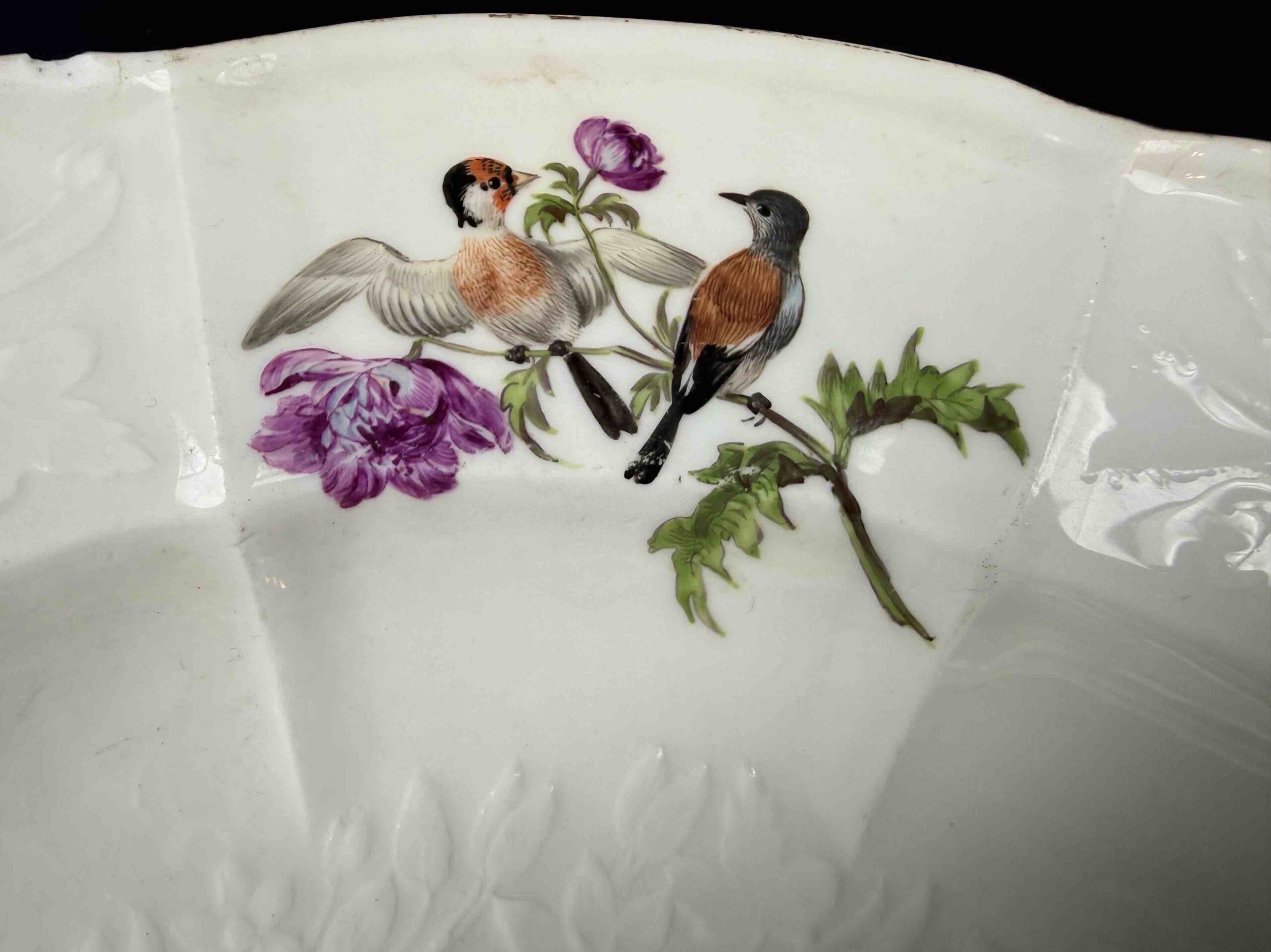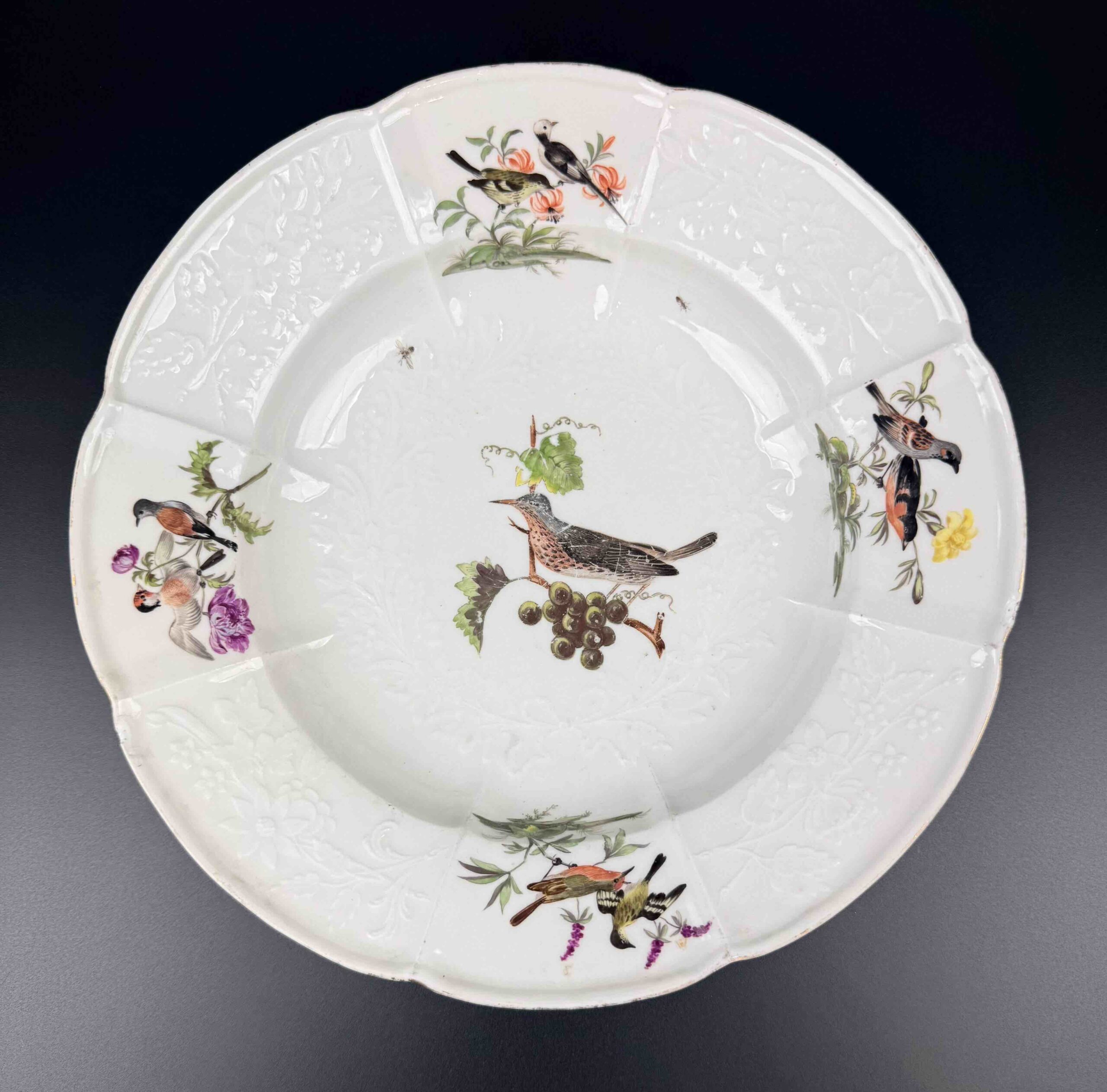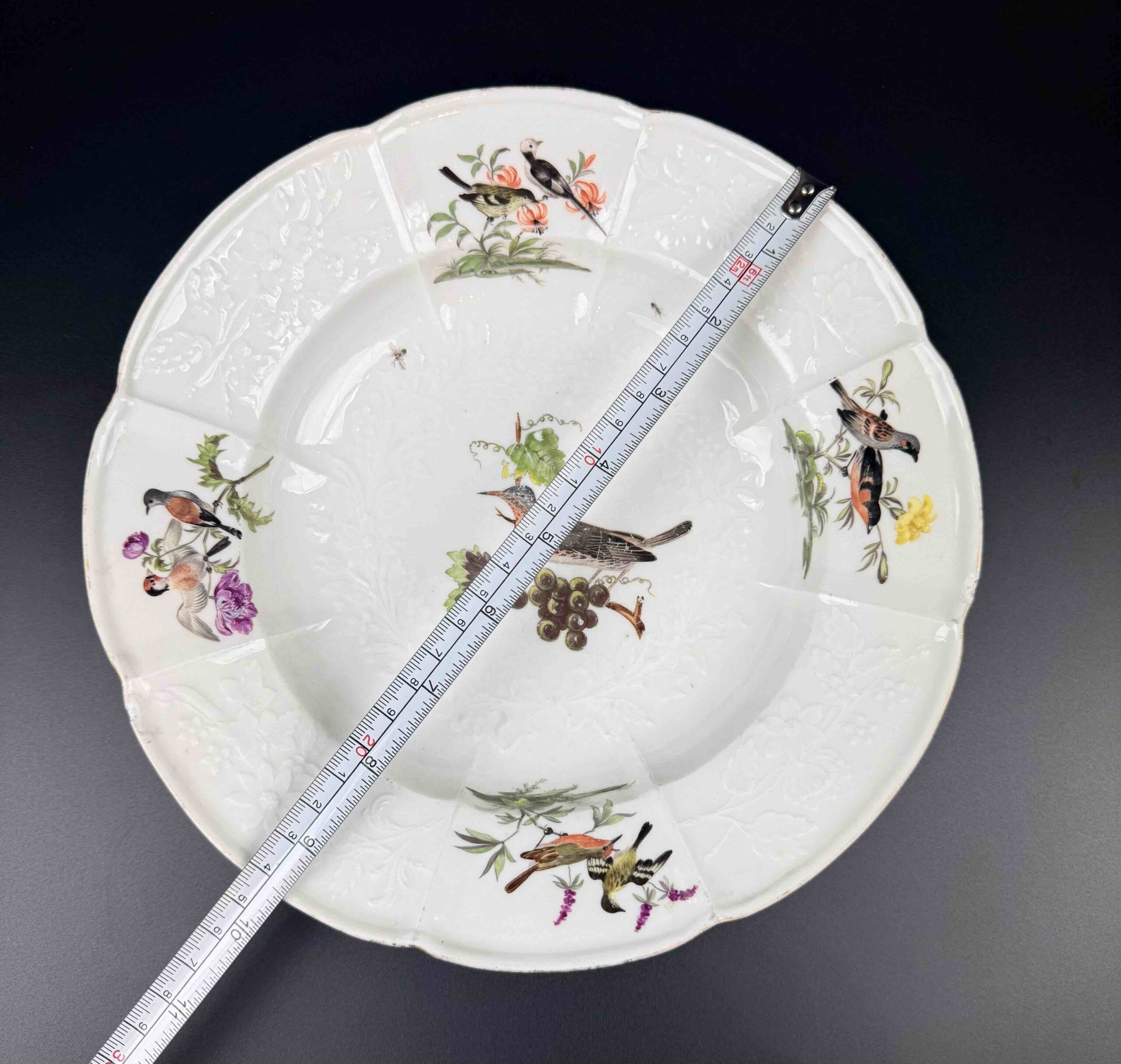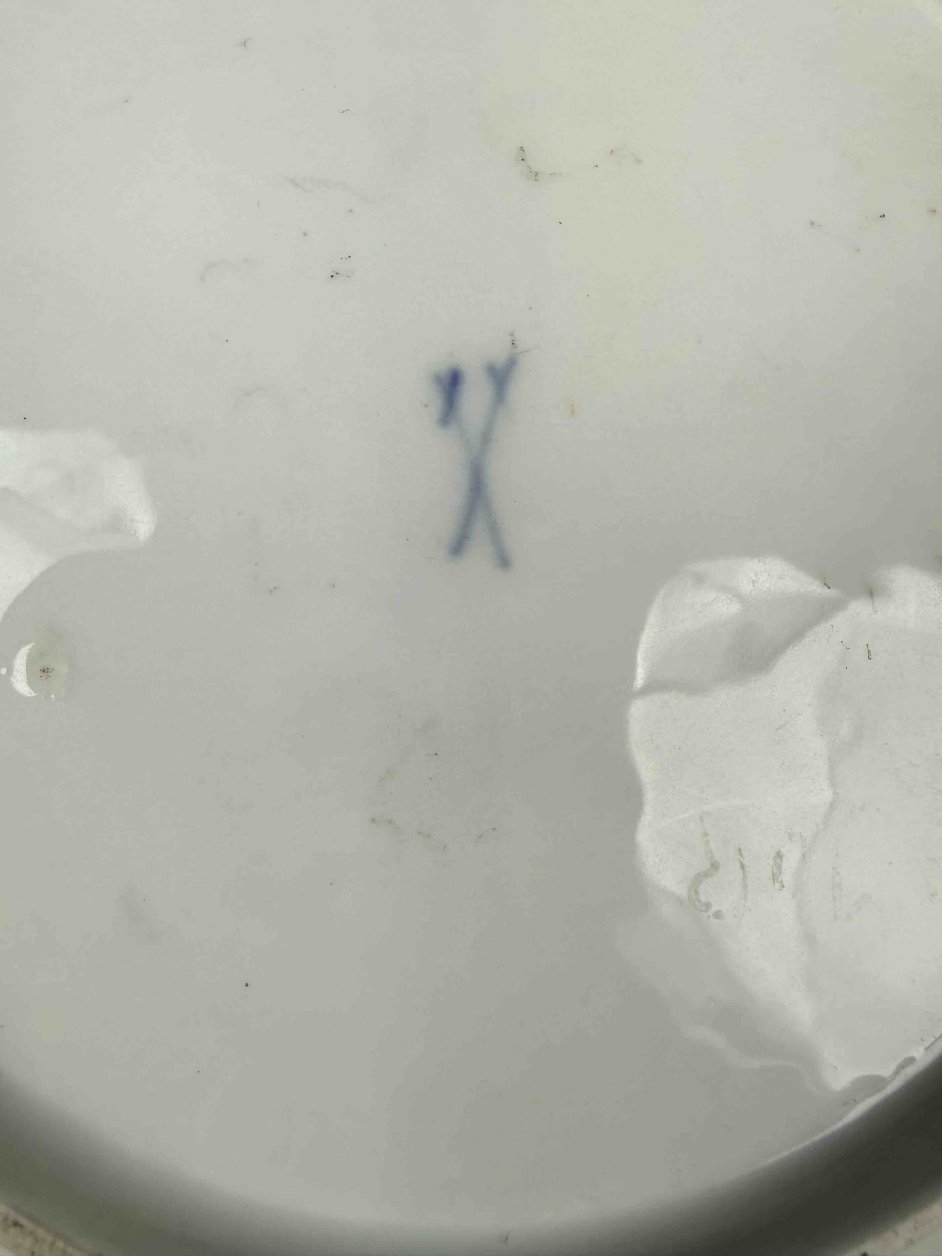 Talerz jest sygnowany miśnieńskim znakiem – podszkliwnymi mieczami, jest to talerz oryginalny i unikatowy. O ile częściej można spotkać naczynia z motywem ptasim w lustrze tylko i wyłącznie , o tyle egzemplarze z rozbudowanym repertuarem ptasim występuje rzadziej.