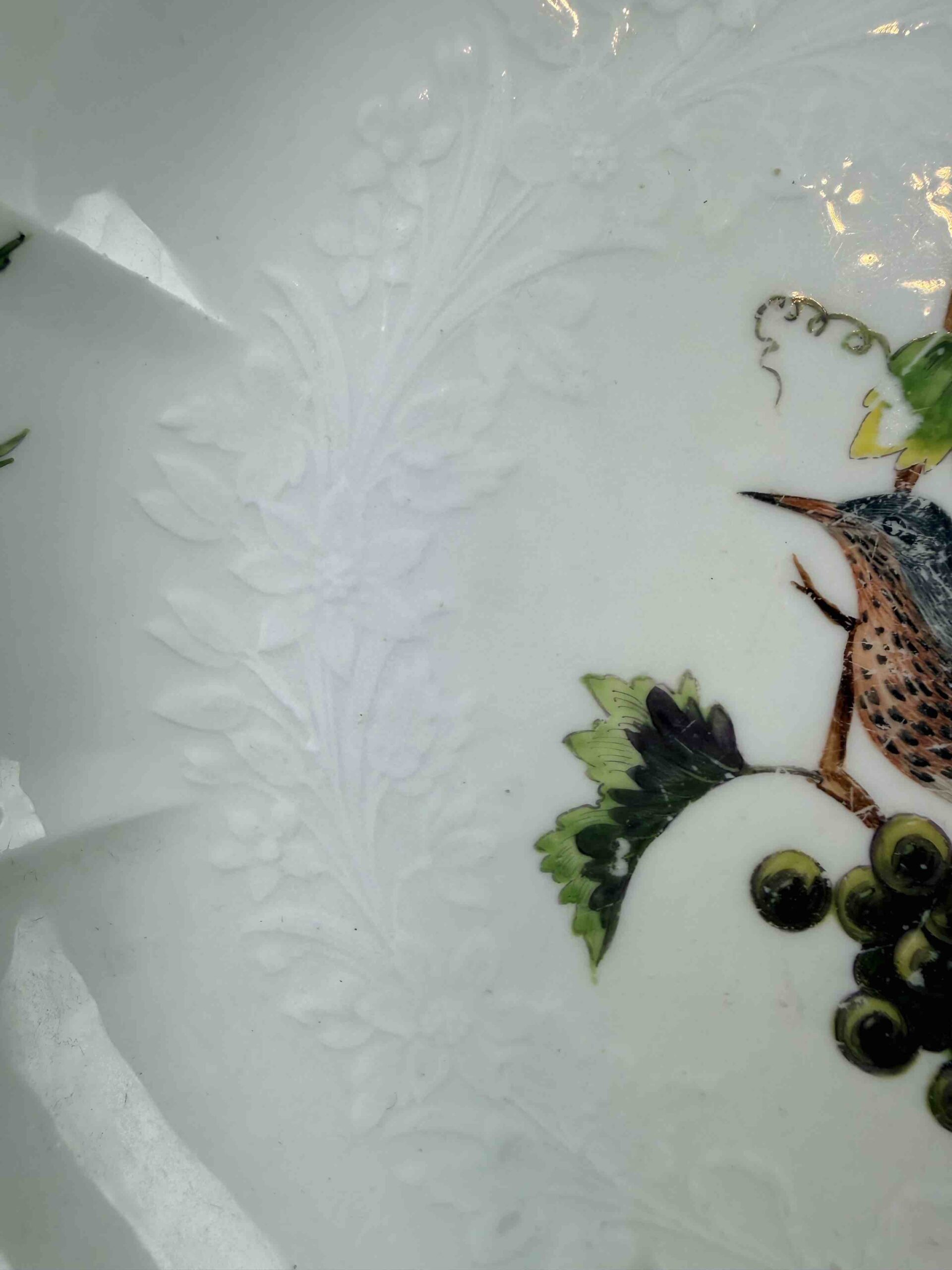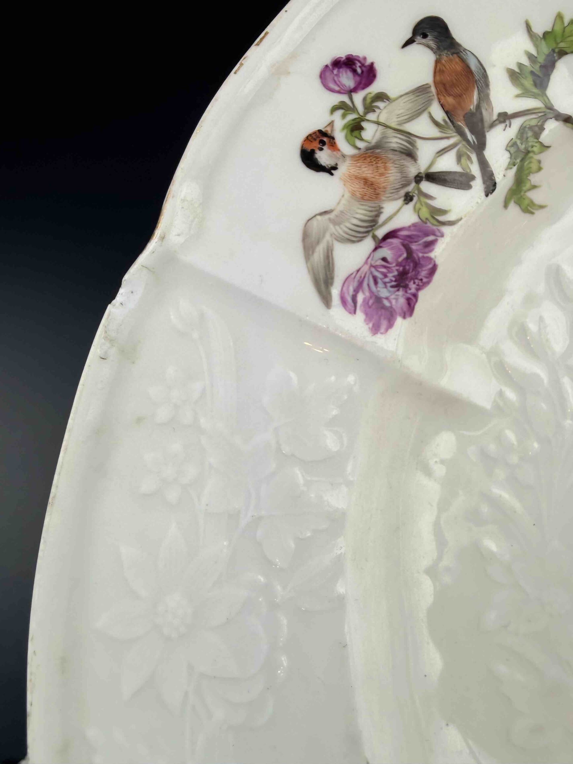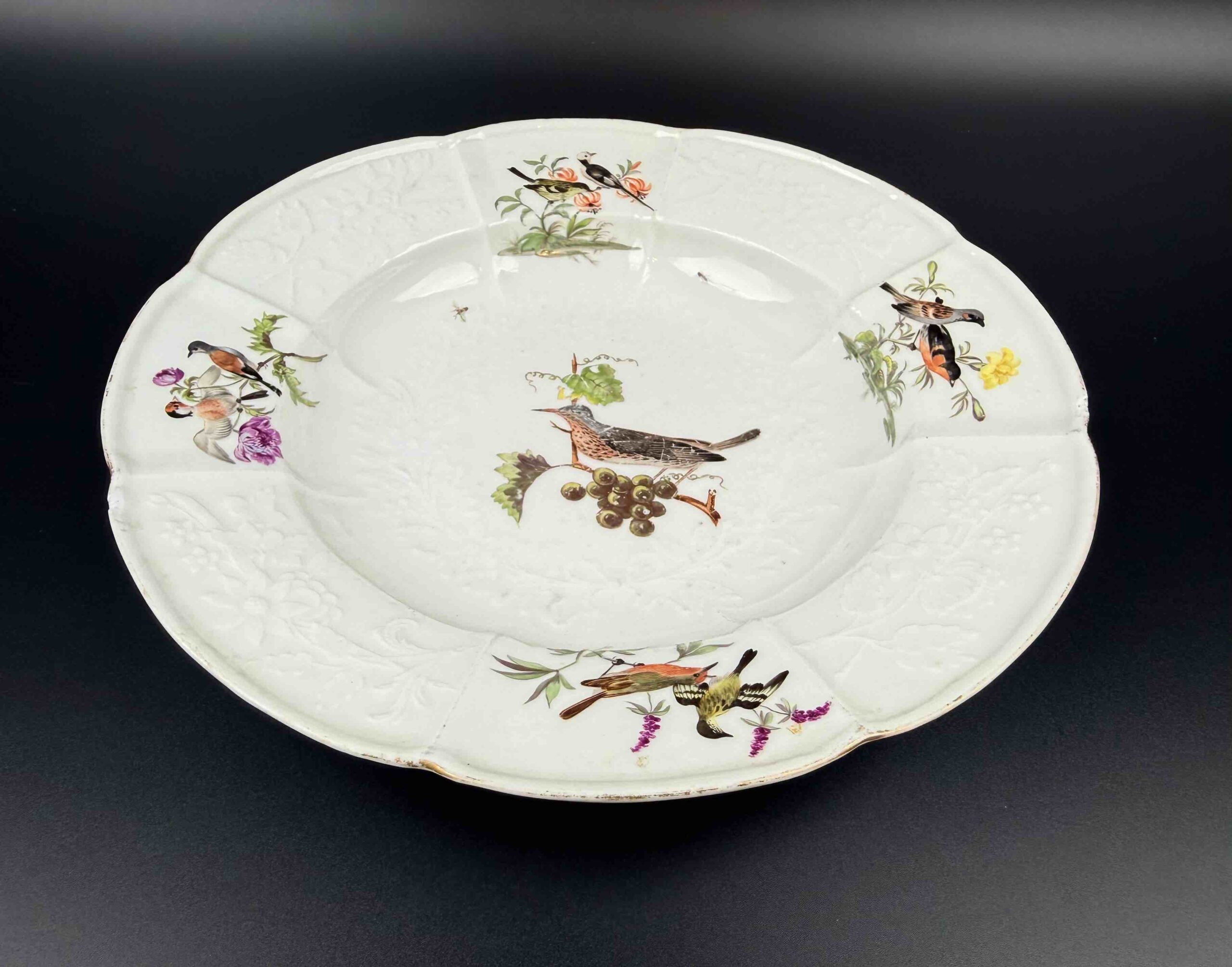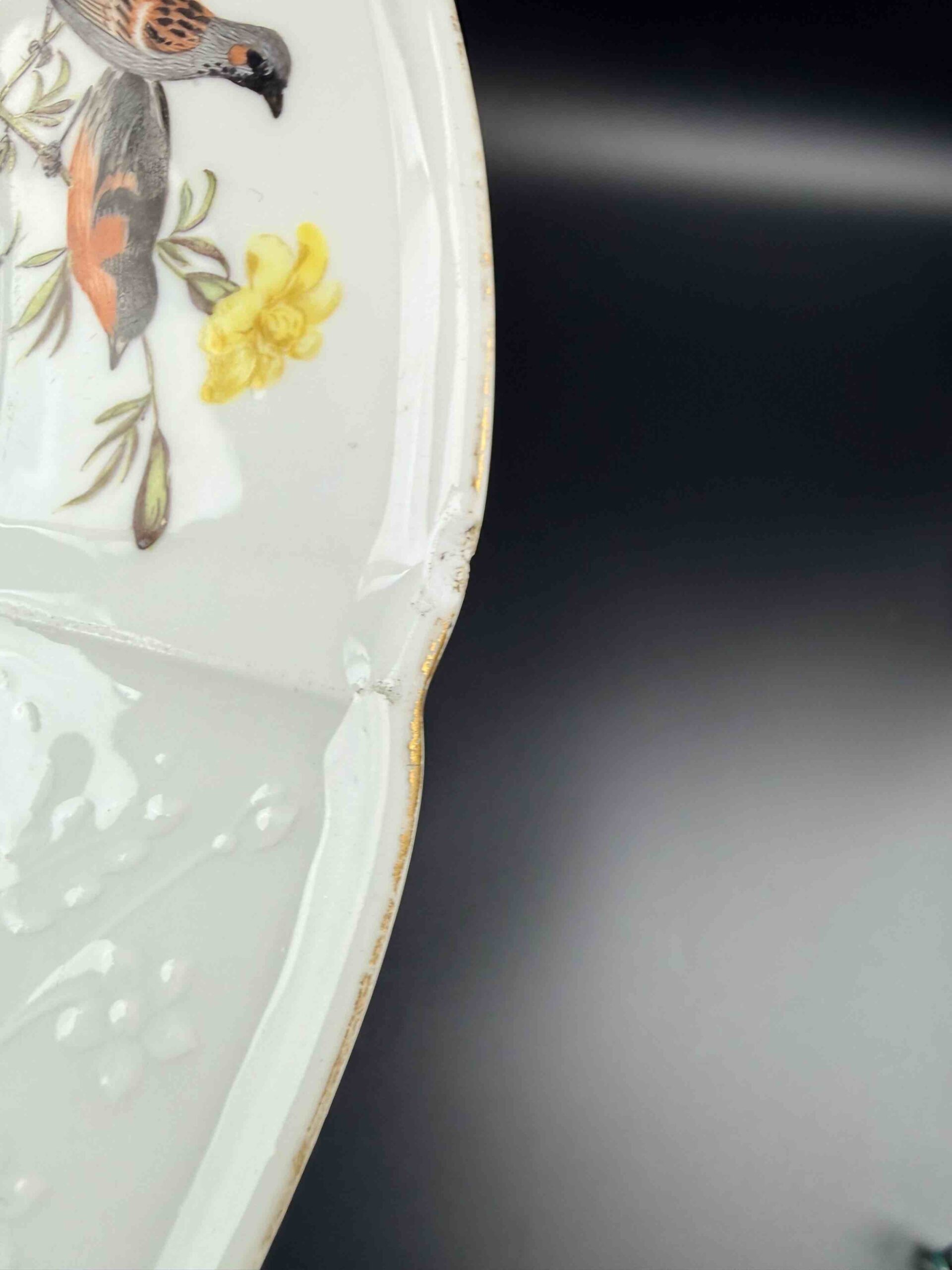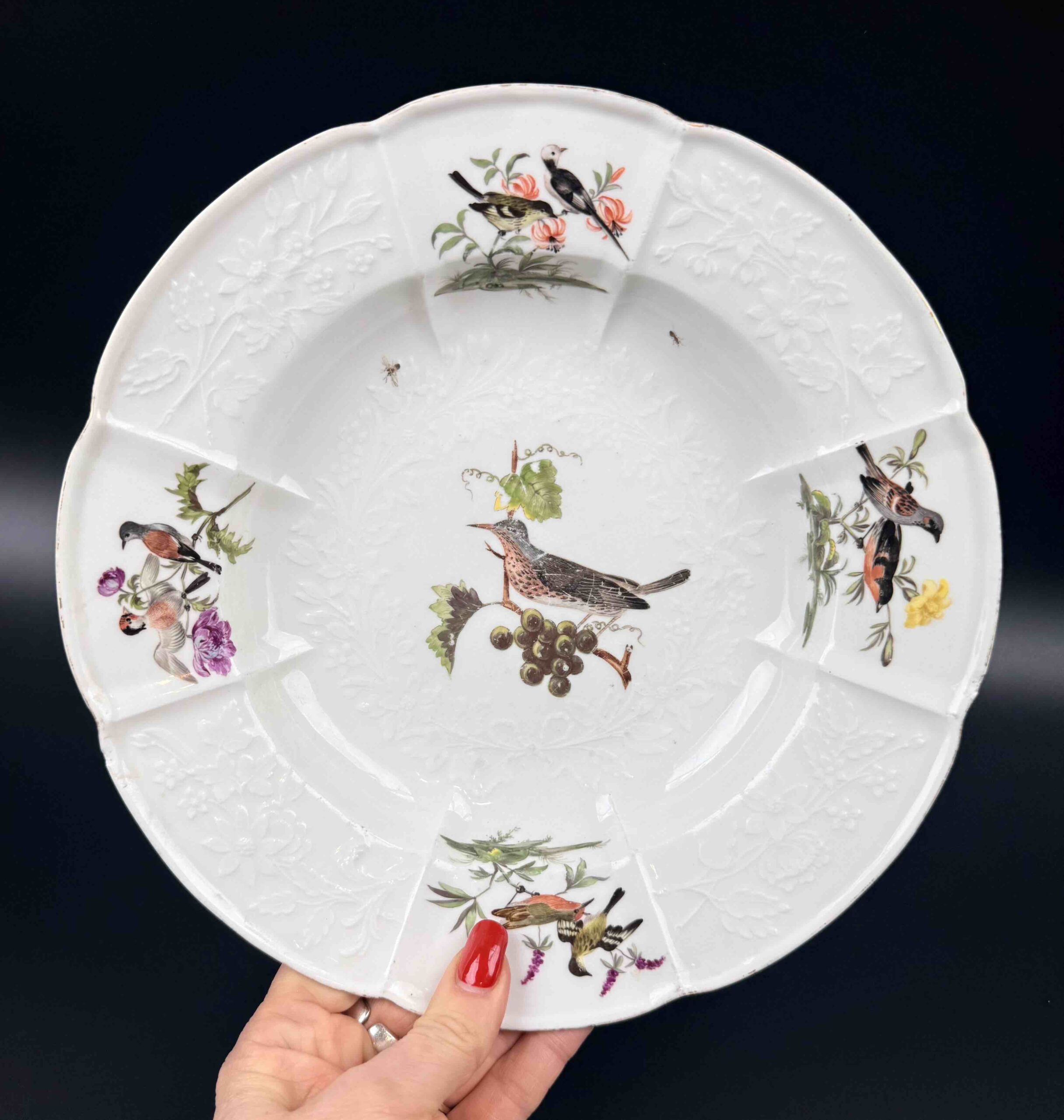 Talerz jest sygnowany miśnieńskim znakiem – podszkliwnymi mieczami, jest to talerz oryginalny i unikatowy. O ile częściej można spotkać naczynia z motywem ptasim w lustrze tylko i wyłącznie , o tyle egzemplarze z rozbudowanym repertuarem ptasim występuje rzadziej.