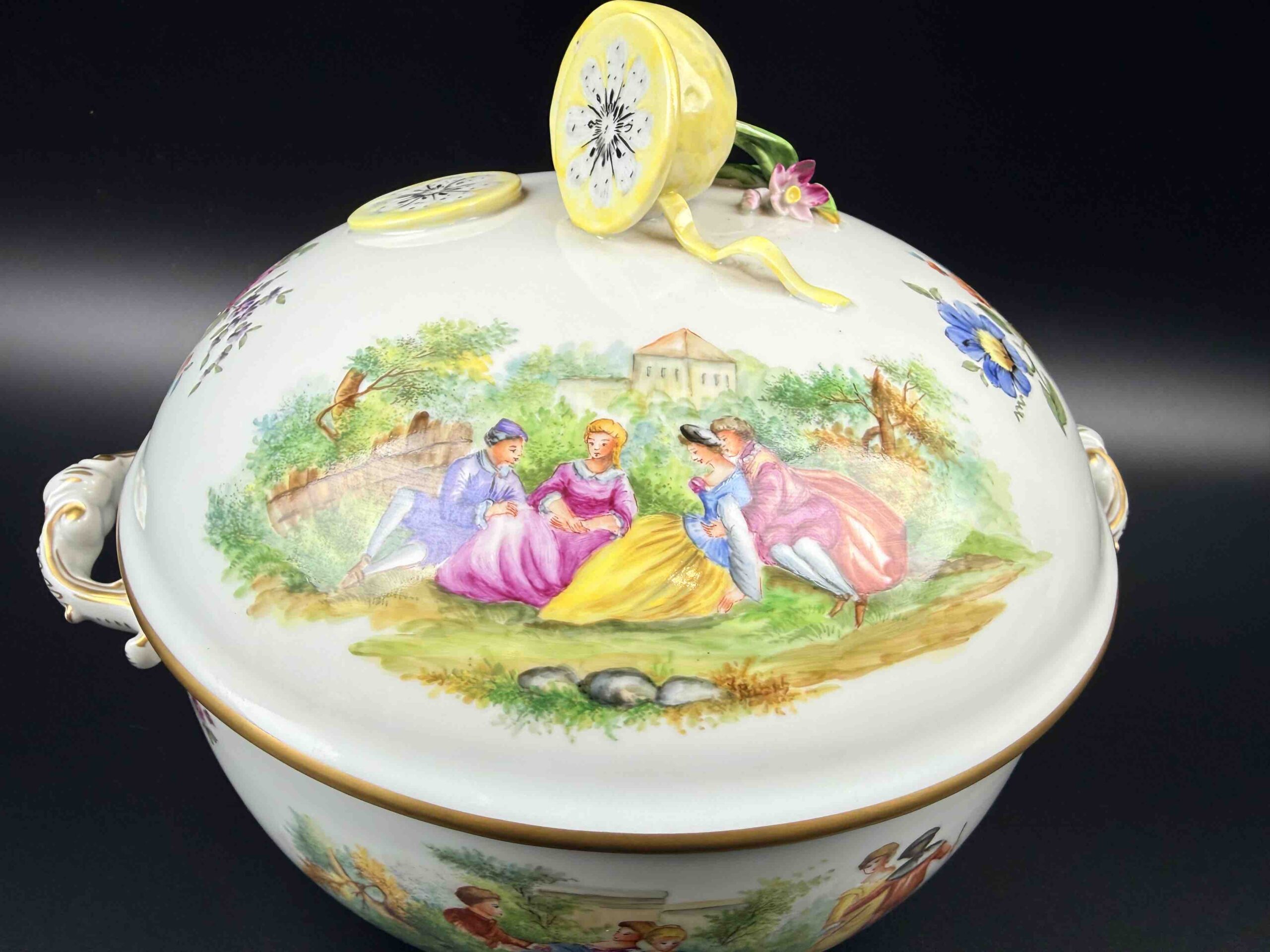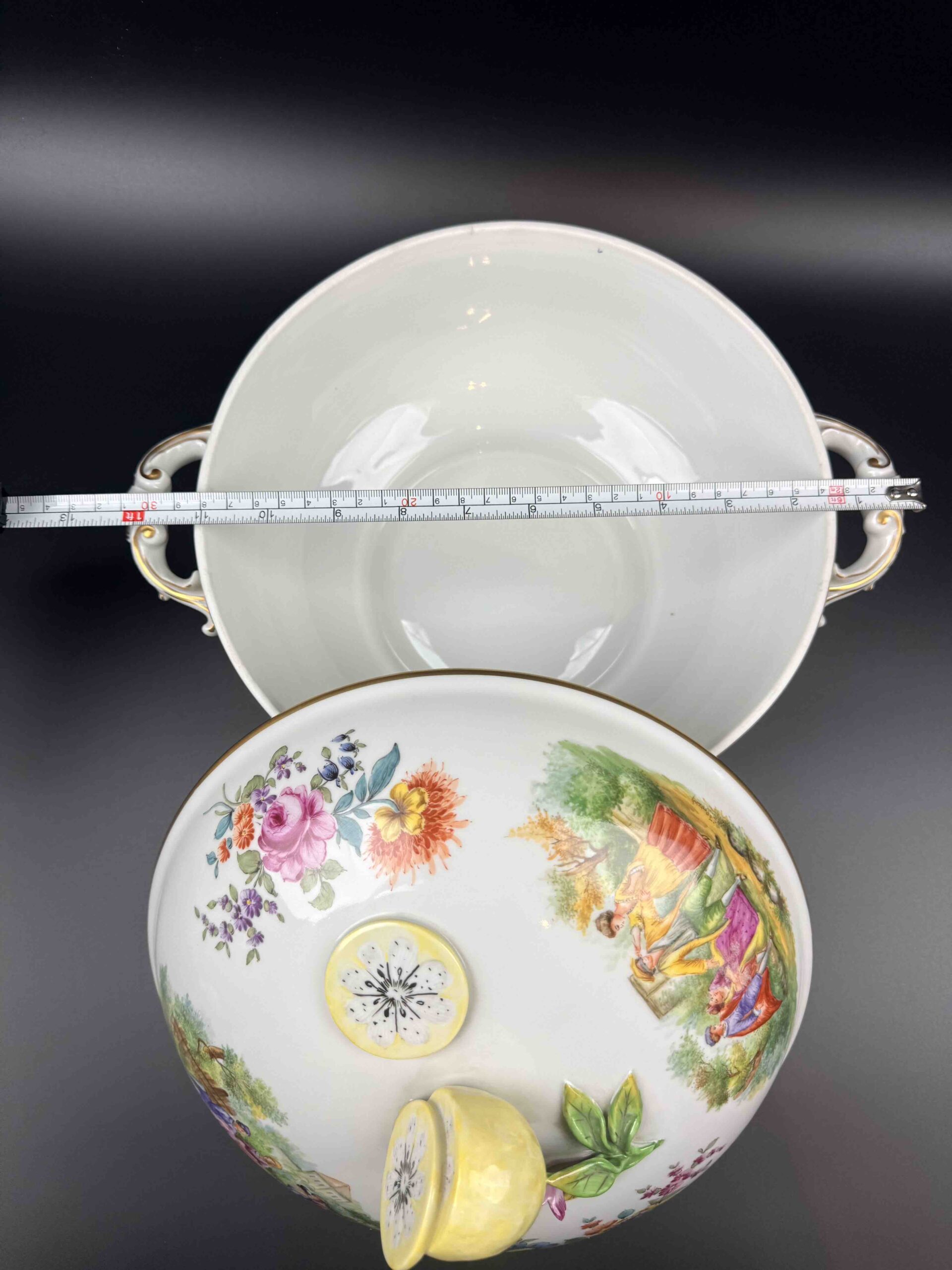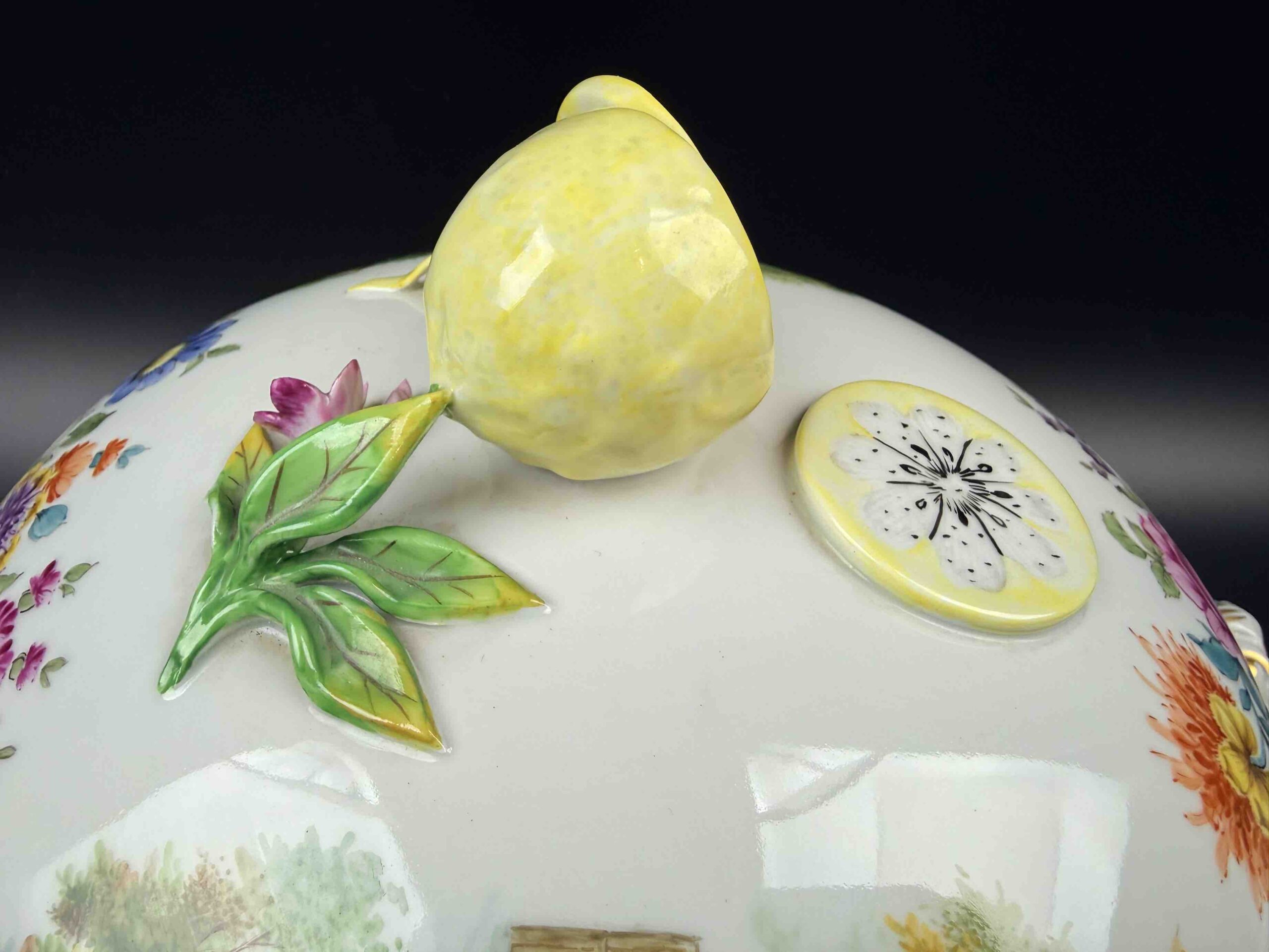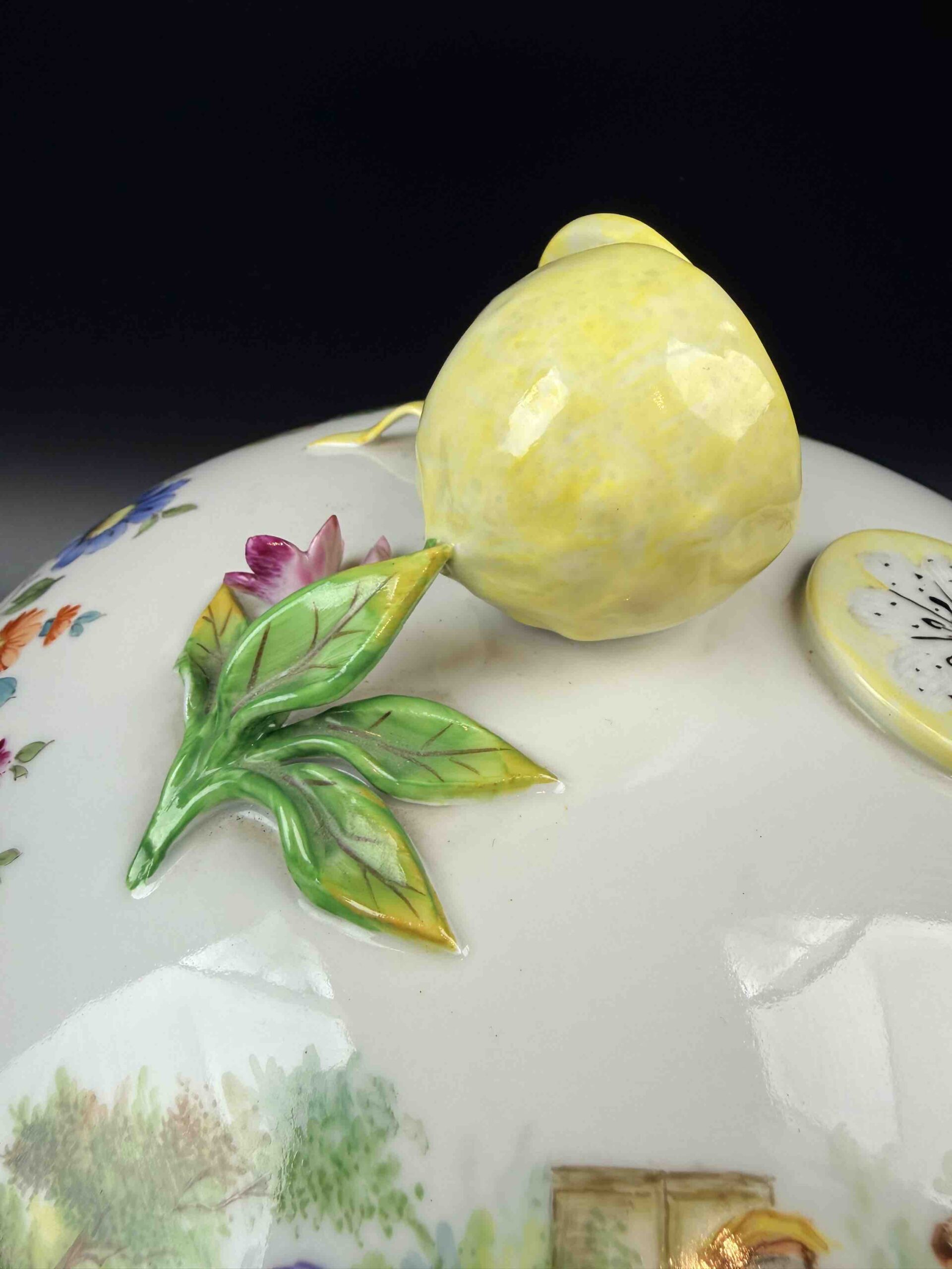 Pokrywę naczynia wieńczy przekrojony owoc cytryny oczywiście z porcelany.