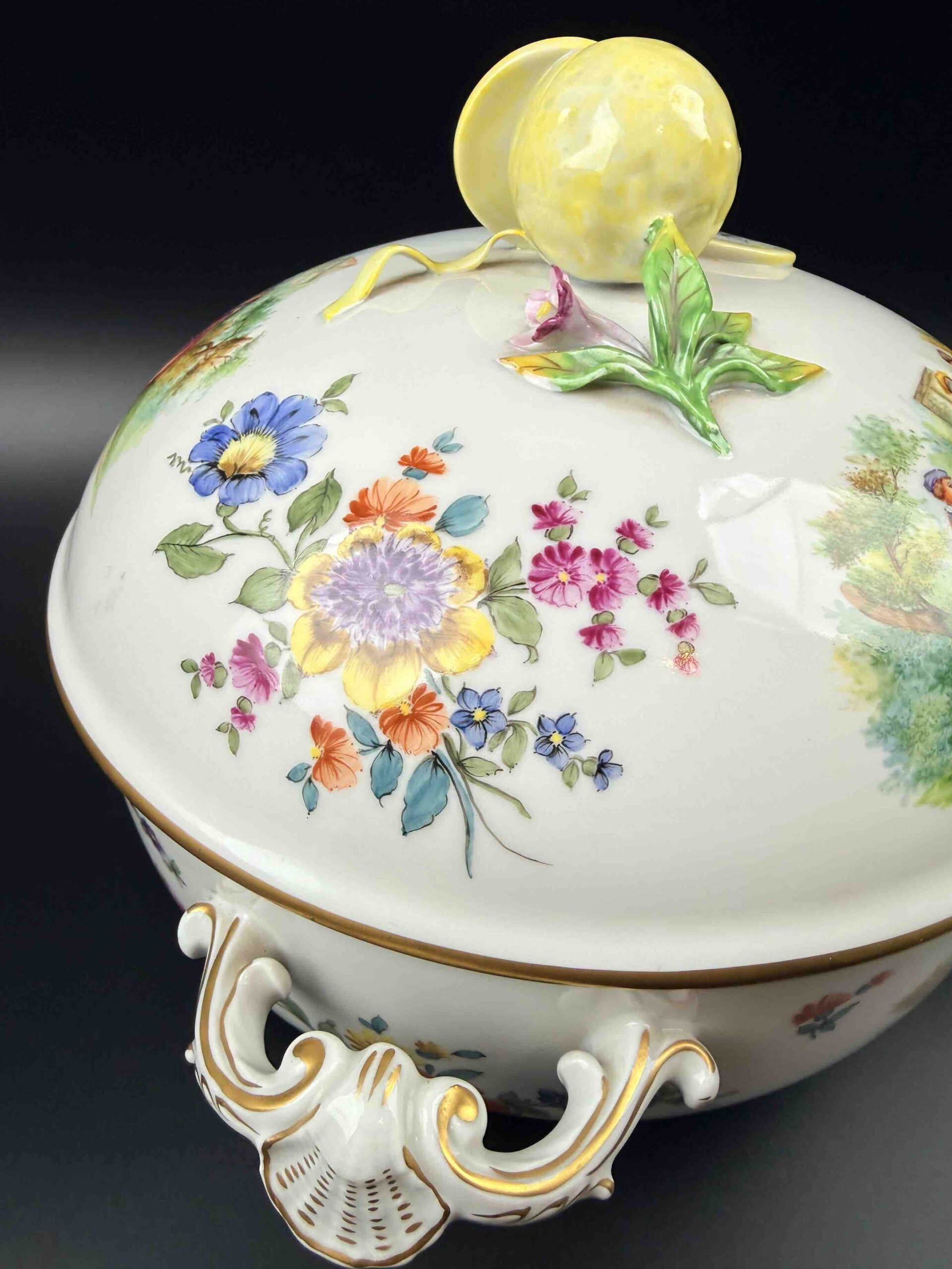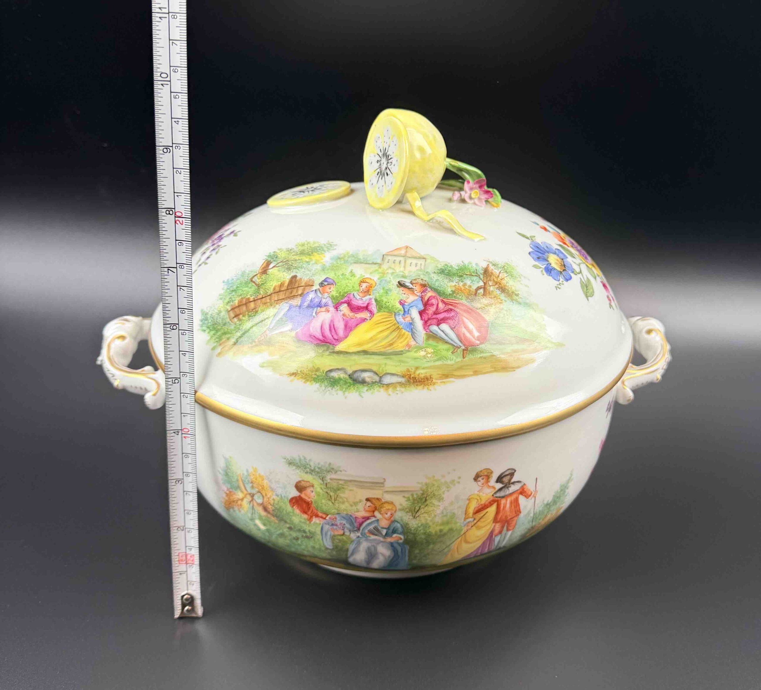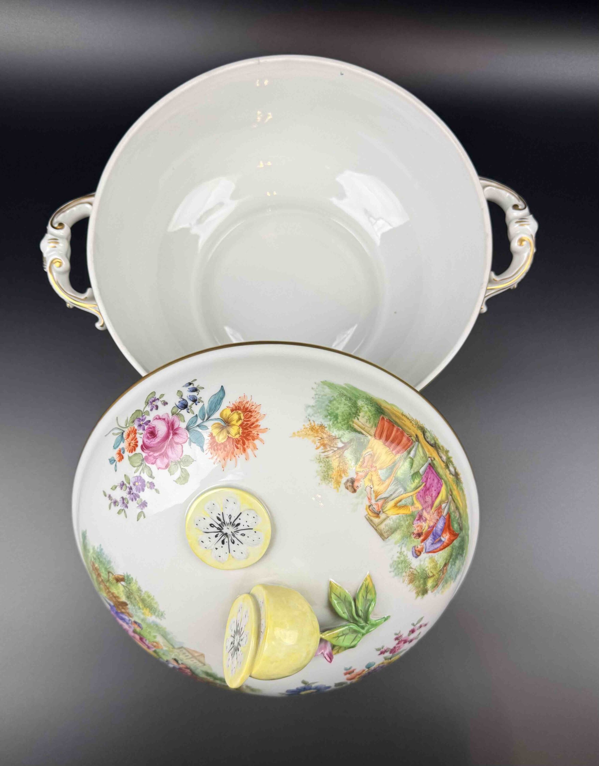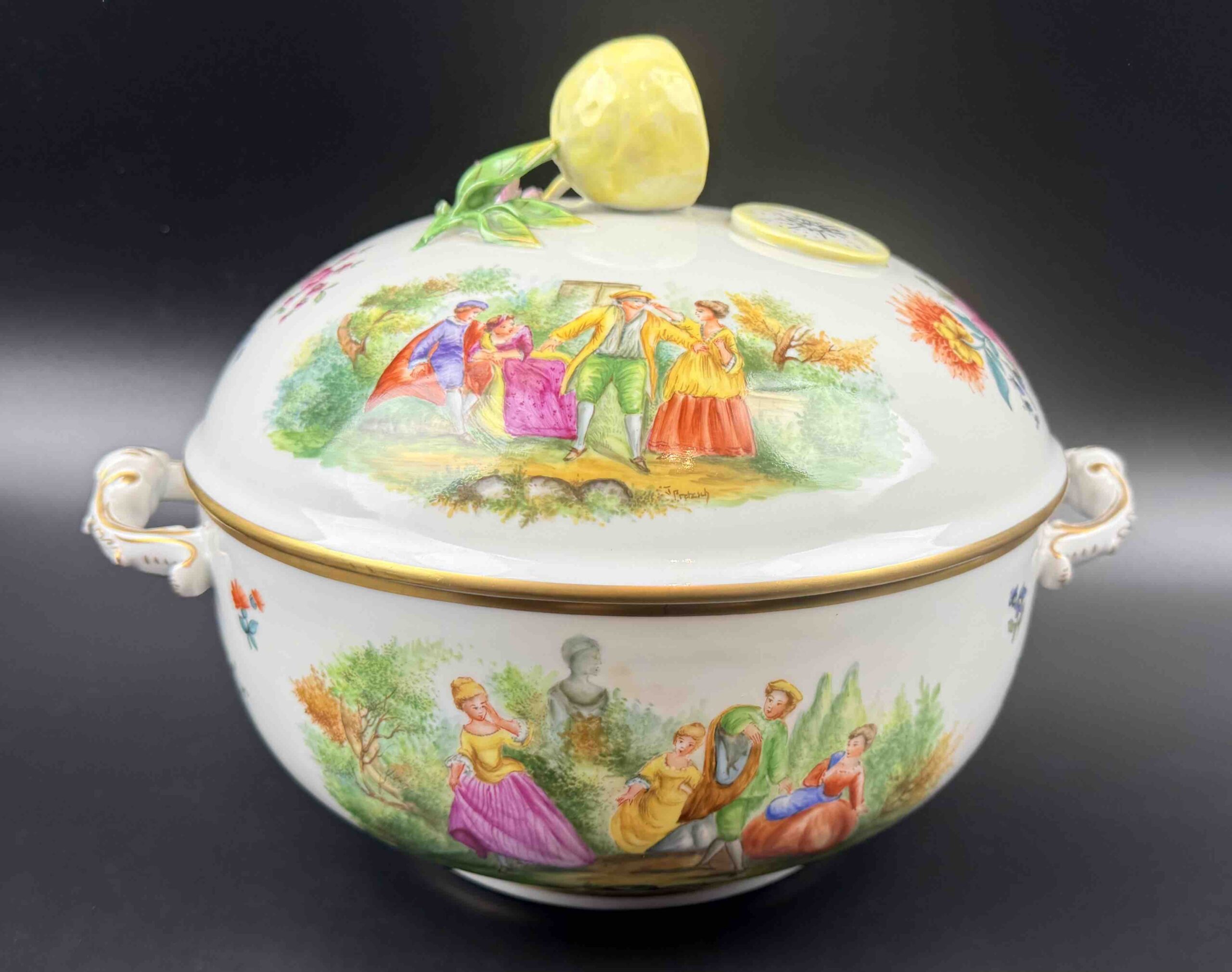 Pokrywę naczynia wieńczy przekrojony owoc cytryny oczywiście z porcelany.