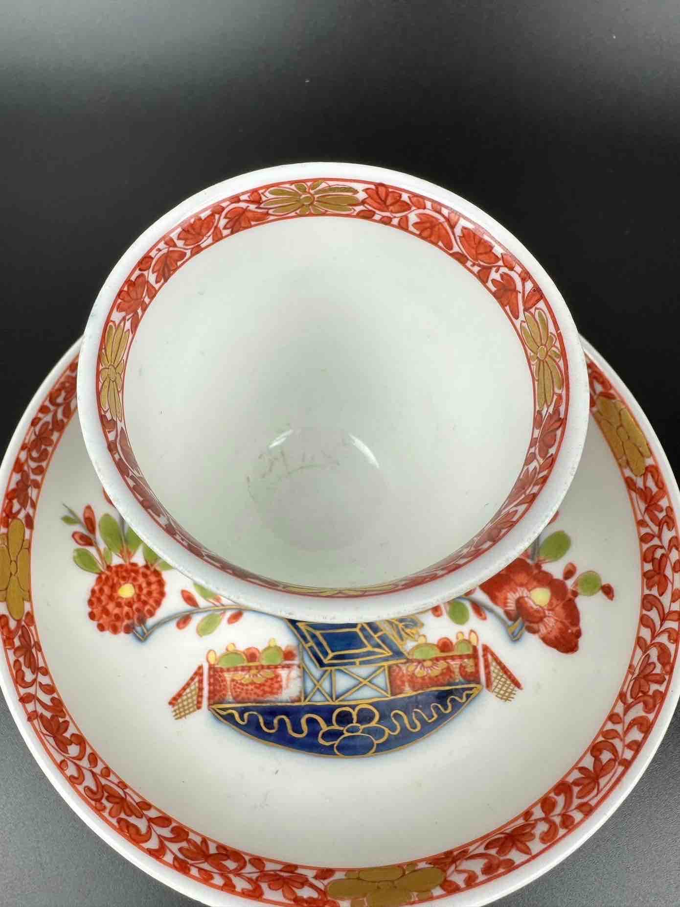 Sygnowana – kobaltowe podszkliwne skrzyżowane miecze, oznaczenie malarza niebieskiego na rancie spodu podstawka (nieczytelne), oznaczenie malarza na rancie spodu spodka – purpurowy krzyżyk.