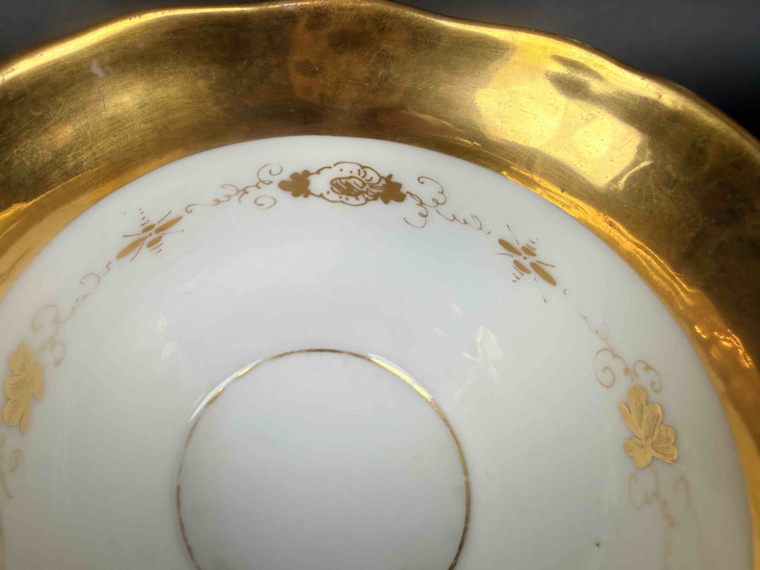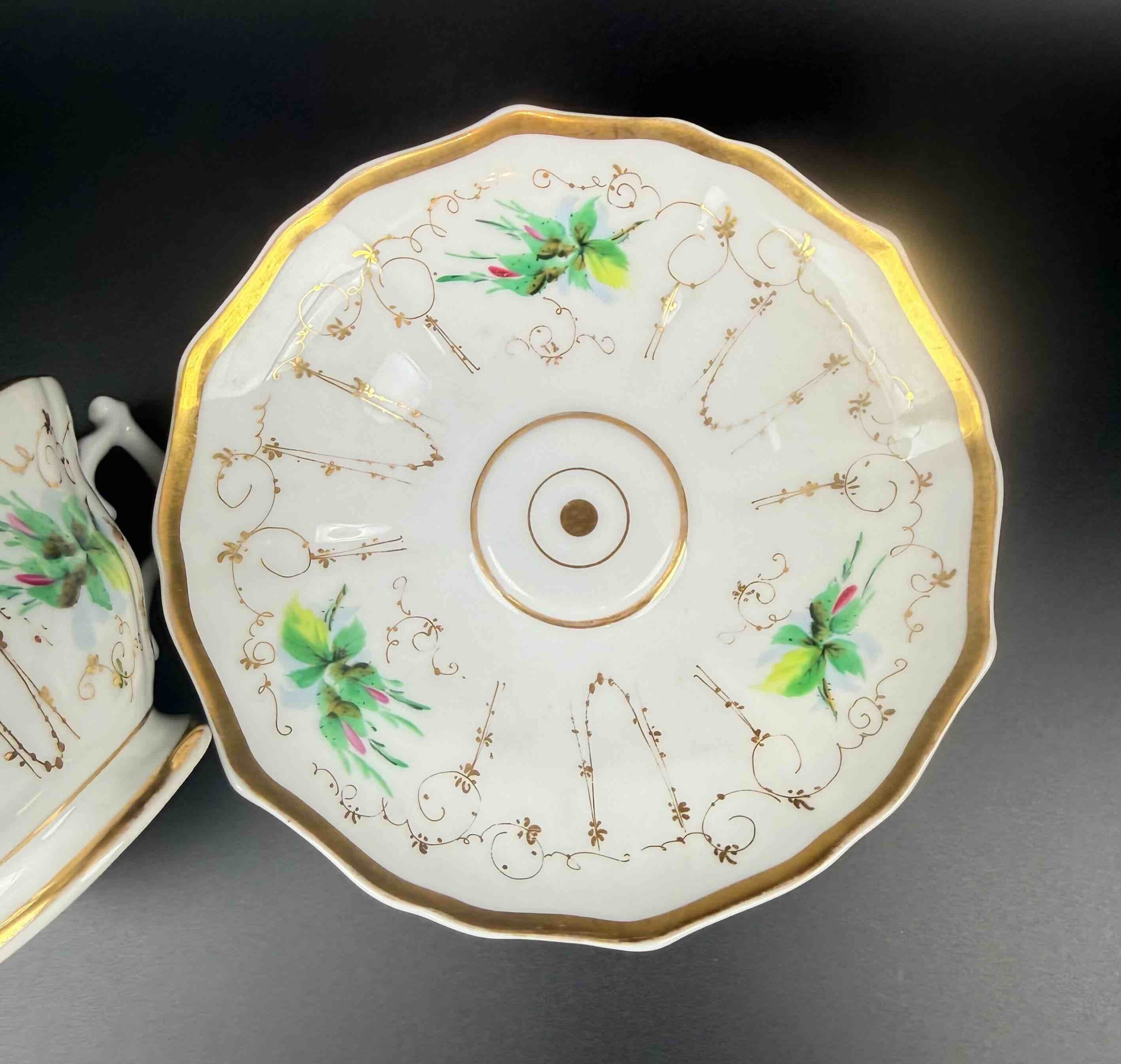 Filiżanka i spodek w towarzystwie złoceń i nieśmiałej zieleni.